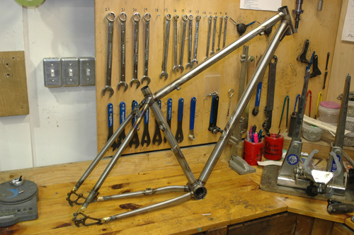 Pat’s Ti road bike with a carbon rear end is just about done. Pat has been training hard for a tour he has planned in the Pyrenees and requested a new bike (he already has quite a nice steel True North) with an emphasis placed on light weight. I have a box full of Campy Record waiting to go on this bike.