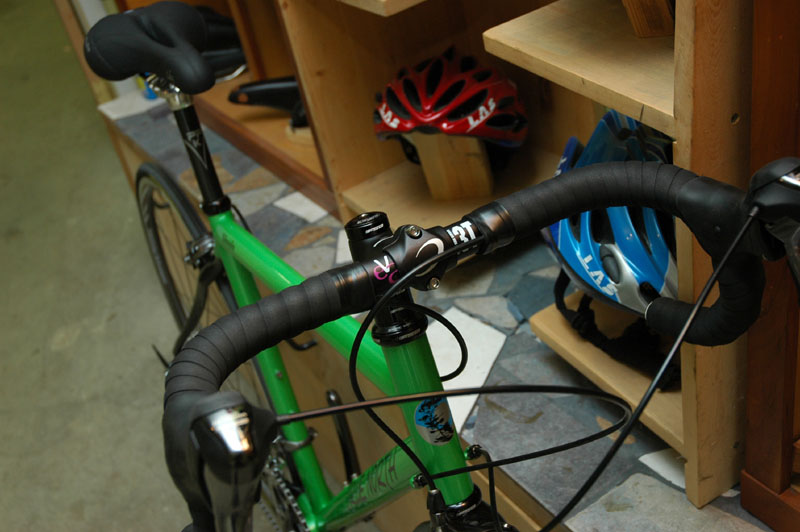 Here are some shots of another custom titanium road bicycle with a carbon rear end and custom wet paint. The colour is a really cool ‘glam’ kermit green, with very fine metal flake. The photos do not do it justice. The bike is built up with the Shimano Ultegra SL group, matching SL wheels, a Selle Italia Lady GelFlow saddle, and an anatomical, women-specific TTT-EVA handlebar.