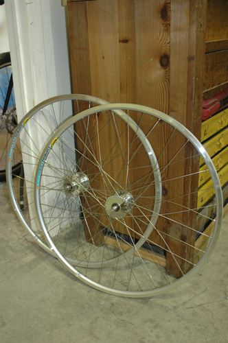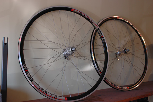 And here we have a set of Campy Centaur hubs laced with Revolution Spokes to DT Swiss RR 1.2 Rims. Both are laced and just waiting to be brought up to tension and trued.