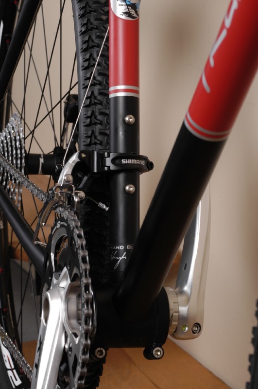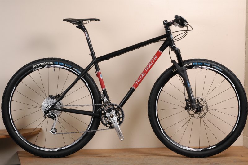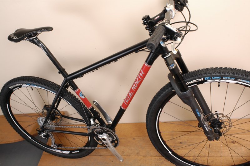 Here is a sneak peak at one of the bikes we will be showing at the Toronto International Bike Show. The bike is a 29er hardtail with a handmade OX Platinum frame, eccentric bottom bracket and a gusseted down tube. The frame can be run as a single speed or a geared bike, and is built around the Pace (now DT Swiss!) RC-29 S80 80mm fork. Currently the bike is build with a full XT build including the new shadow rear deailleur and the soon to be available XT level Shimano 29er wheels. The bike is finished of with a FSA K-Force seatpost and bar, FSA OS-115 stem and an SLR saddle. The tires are the 29er Hutchinson Pythons, run tubeless. The bike will be seeing duty over the summer as a demo bike, before heading off to BC to race in the BC bike race under David Dermont.